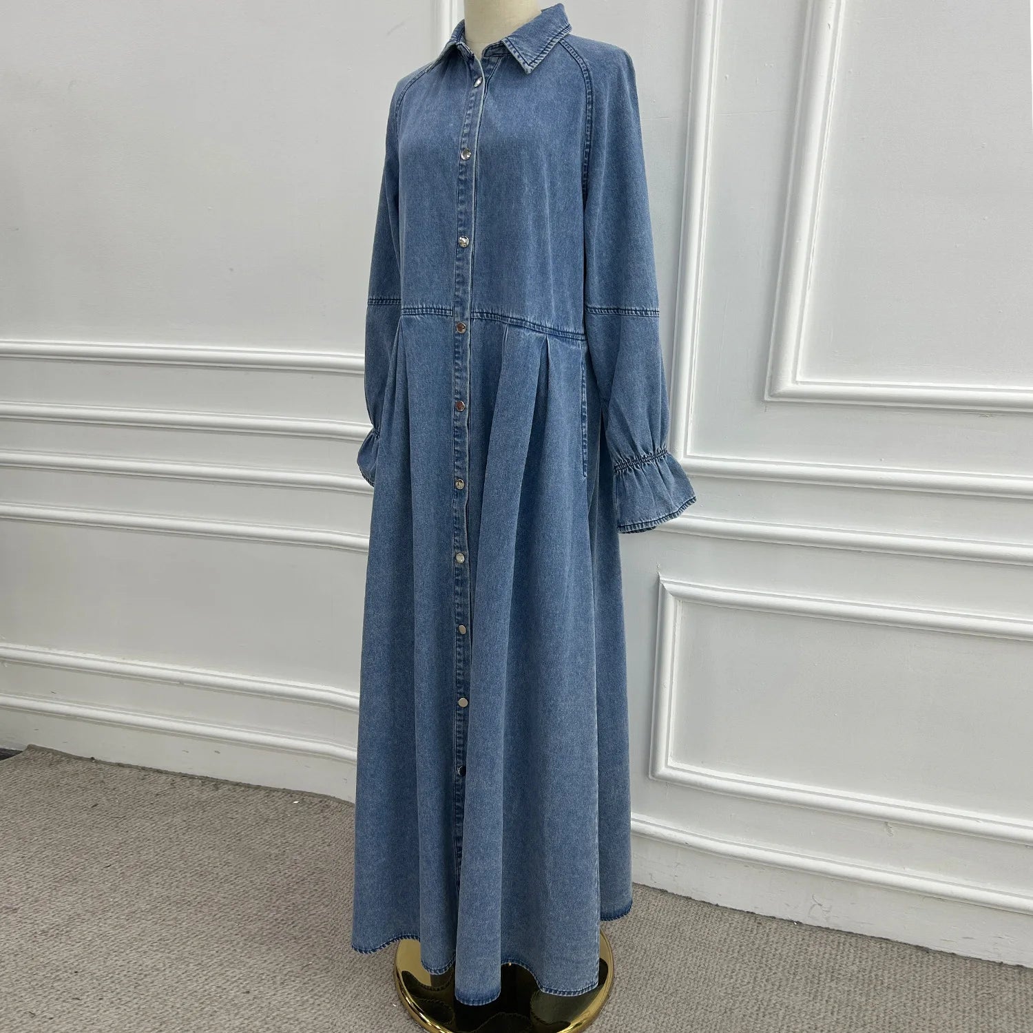 Denim Maxi Abaya Dress - Single Breasted Long Sleeve Muslim Dress for Women