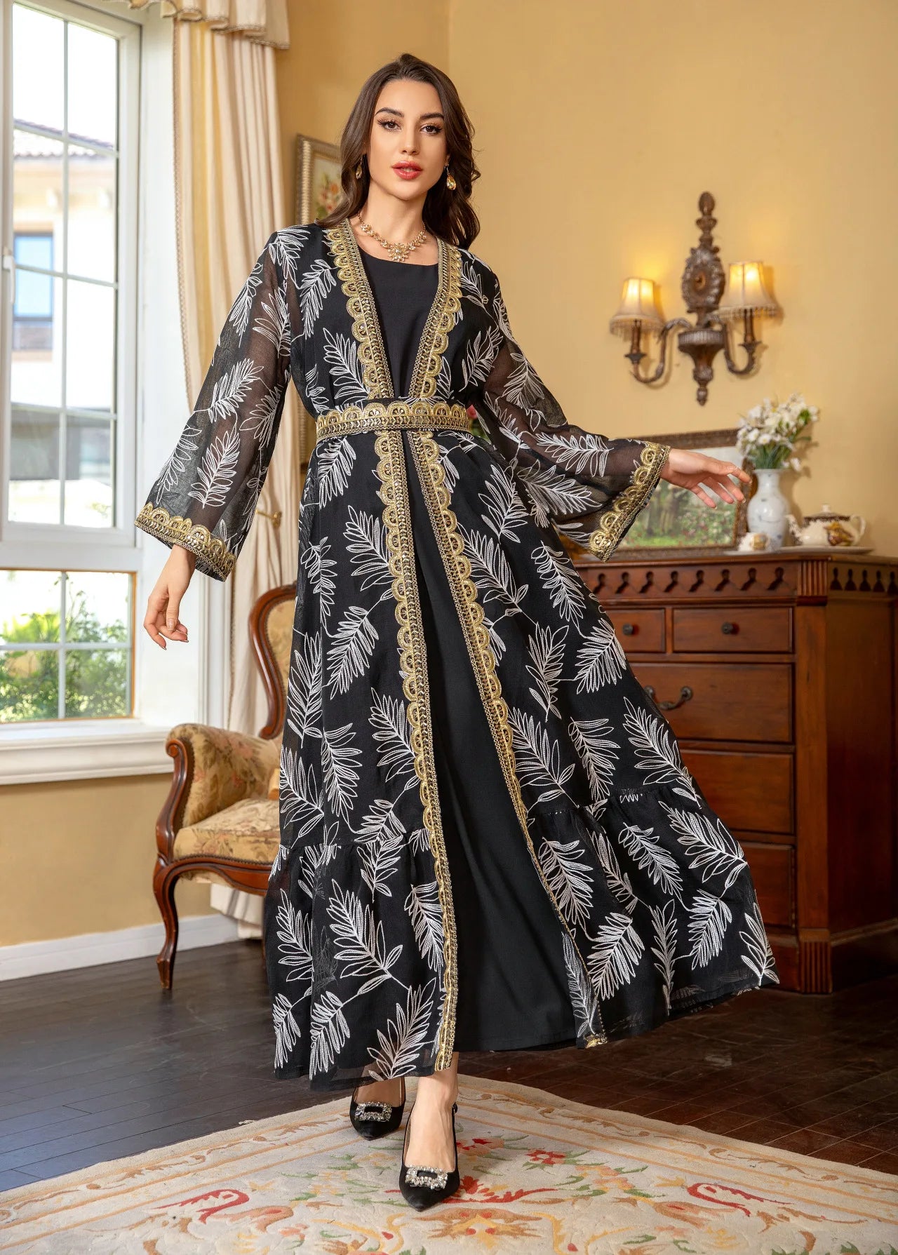 The Coordinating Robe: The finishing touch that completes your look. The open-front design creates beautiful movement and adds an extra layer of sophistication. Together with the kaftan, it creates a complete, polished appearance.